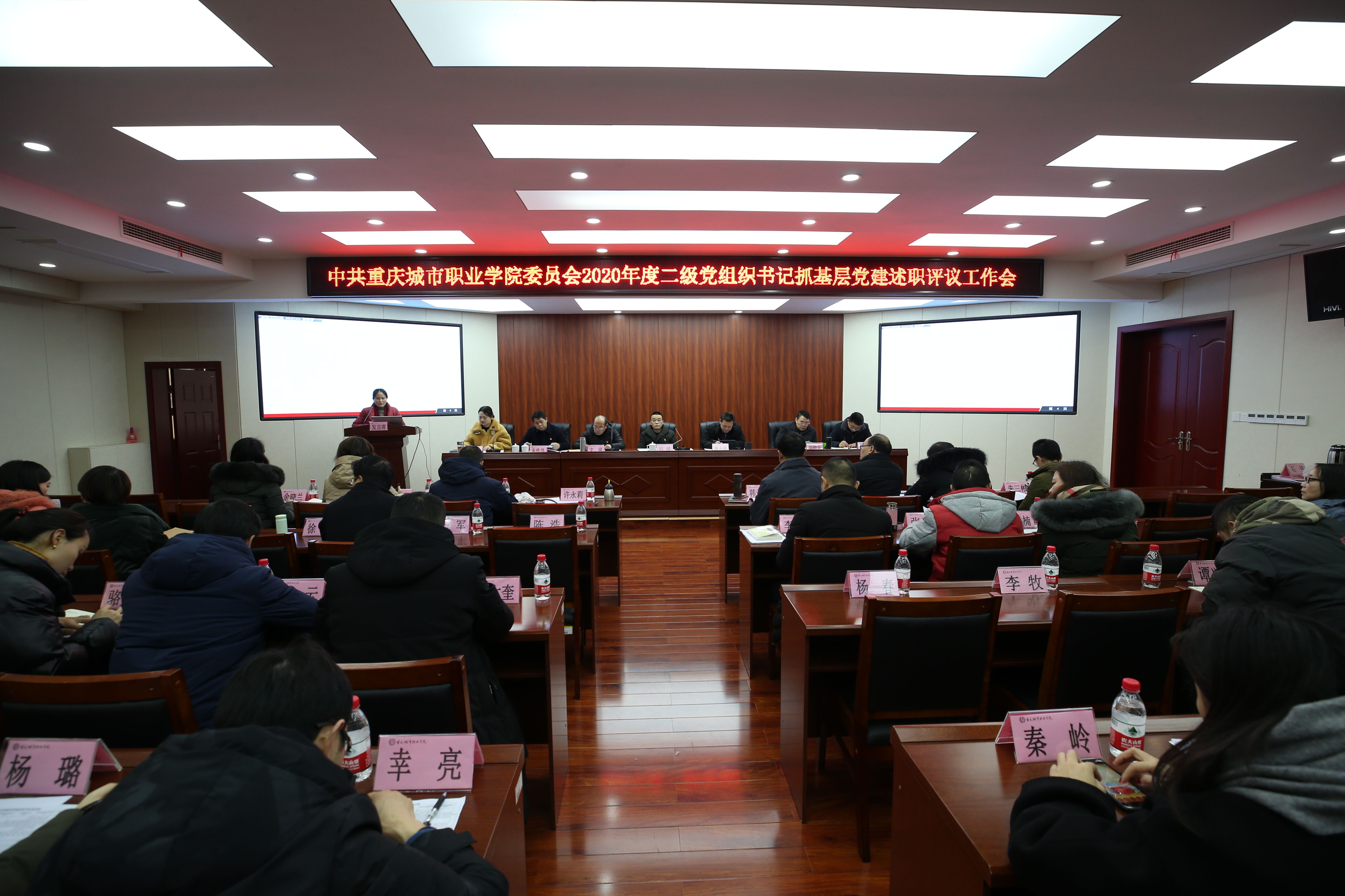 12月29日下午,学校在博学馆510会议室召开2020年度二级党组织书记抓基层党建工作述职评议工作会。在家党委班子成员,各党组织书记、副书记,纪检监察室主任,校工会专职副主席,校团委书记,各院系专职组织员、团总支书记和党员党员群众代表参加会议。会议由党委委员、组织人事处处长曹月主持。